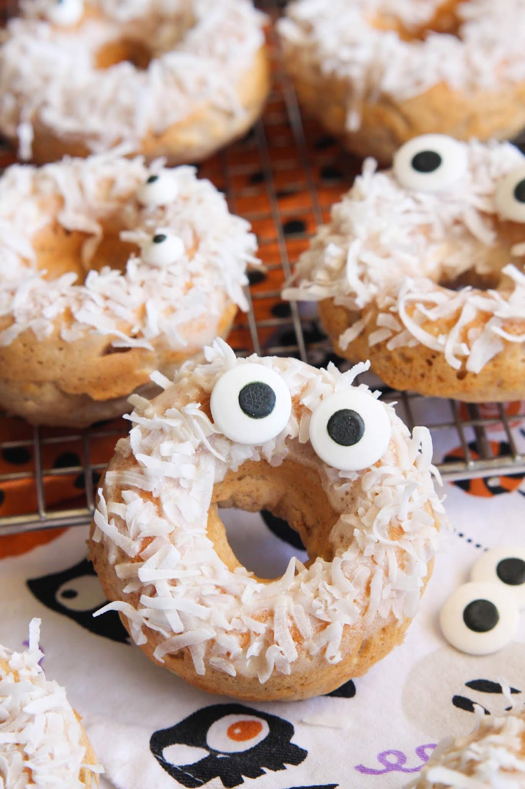 For the glaze: In a small bowl, whisk together Monk Fruit In The Raw, cornstarch, milk and vanilla. Place coconut in a separate bowl or plate. Dip one side of each donut into the glaze and then in the coconut. Place two googly eyes or chocolate chips onto each donut and allow to dry on a rack. Makes 12 donuts.